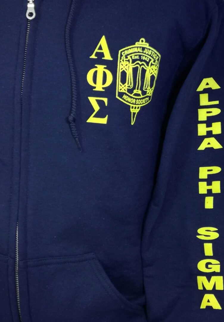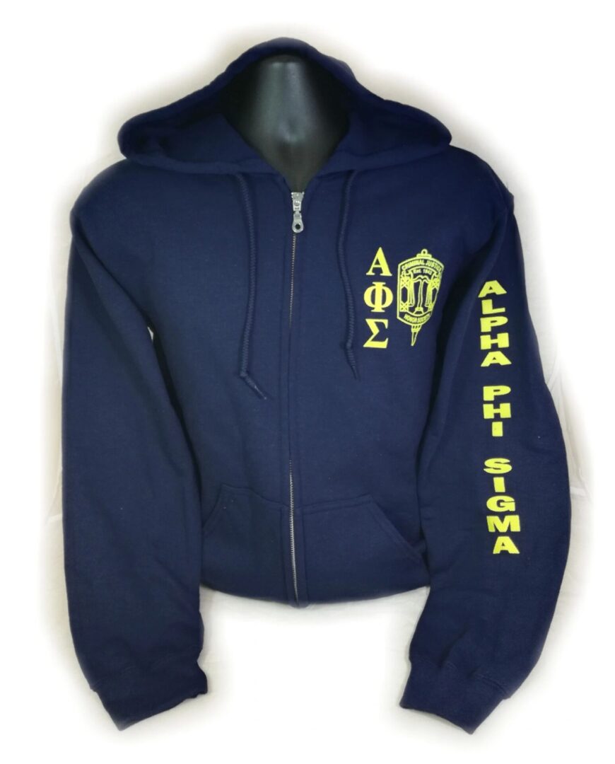Zippered Jacket with Greek Letters and Key with Printed SleeveColor: Navy Blue with gold letteringKeep warm while showing your APS pride with this affordably priced jacket!Fabric: Gildan Heavy Blend, 8 oz. 50% cotton, 50% polyester Features:• Pill-resistant air jet yarn• Set-in sleeves• Pouch pockets; hood with matching drawstring; YKK metal zipper• 1×1 ribbed cuffs and waistband with spandex; double-needle stitching throughout